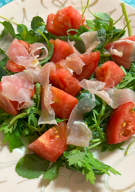 サラダリーフはケールとベビー春菊のミックスになっていて、春菊が苦くて食べられませんでした。普通春菊って、生でサラダに入れるもの?それも大量だったので、苦くてすごかったです。ベビーレタスにしてほしかったなぁ~。